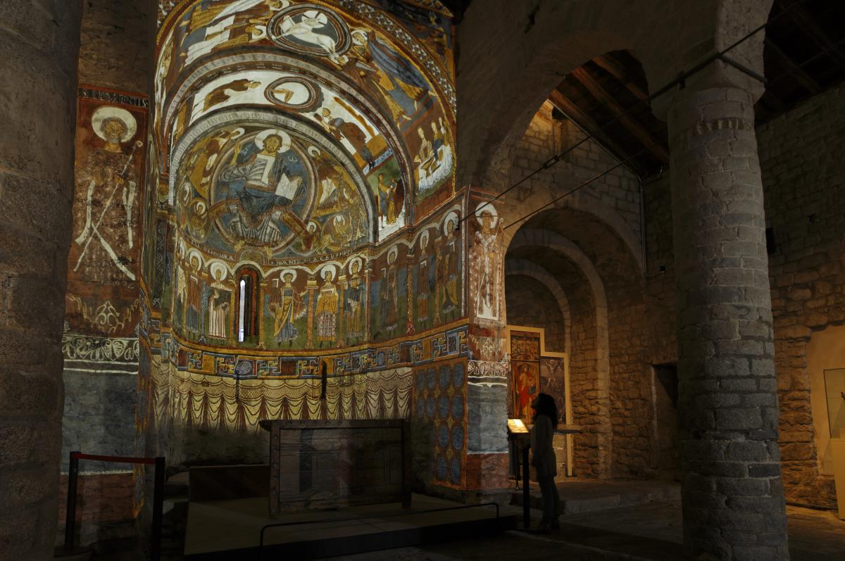 Deixem per al final una de les grans experiències d’aquest viatge: arribar a l’ermita de Sant Climent de Taülli trobar-nos al seu interior el pantocràtor que hem vist, fa un parell de dies, a les grans sales del MNAC, a Barcelona. Gràcies a la tècnica del videomapatge veiem les pintures murals originals de mida real i en alta definició, projectades a l’absis. Amb les noves tecnologies, després d’un miler d’anys, han viatjat, com nosaltres, de Barcelona a la vall de Boí, de la Mediterrània als Pirineus, per tornar a lluir al lloc on van ser pintades.