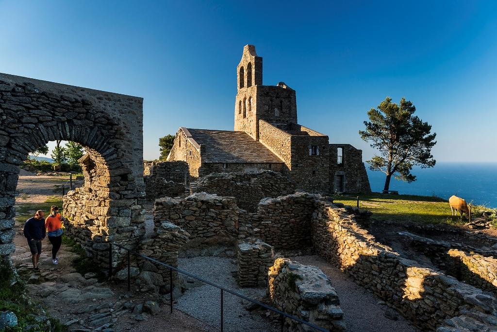 Wir beginnen unsere Kulturreise in Sant Pere de Rodes, am Rand des Mittelmeeres. Eine steile, verschlungene Straße bringt uns hinauf und bietet zugleich einen atemberaubenden Blick auf die Küste. Die Felsen vom Cap de Creus, die weißen Häuser der Küstenorte, die breiten Buchten von Roses und El Port de la Selva und die unendliche Weite des Mittelmeeres sind von dieser herrlichen Stelle aus zu sehen. Nach der Ankunft beim Parkplatz fällt unser Auge zunächst auf die Umgebung. Auf der einen Seite sehen wir die Kapelle Santa Helena de Rodes, auf der anderen das große Kloster Sant Pere de Rodes und oben am Bergkamm die Festung Sant Salvador. Wir besichtigen zuerst die vorromanische Kapelle mit Glockengiebel und danach das Kloster, eines der wichtigsten Beispiele romanischer Architektur in Katalonien, das uns mit Kirche, Glockenturm, zwei Kreuzgängen, Krypta, Keller, dem Bereich für die Zellen der Mönche und sonstige Nebengebäude sowie seiner auf Schritt und Tritt zu spürenden Atmosphäre in seinen Bann schlägt. Nach dem Besuch des Klosters führt uns ein Fußweg in 25 Minuten zur Festung Sant Salvador, einer Ruine aus dem 11.-13. Jahrhundert, die zugleich einen der herrlichsten Aussichtspunkte des Landes bildet.