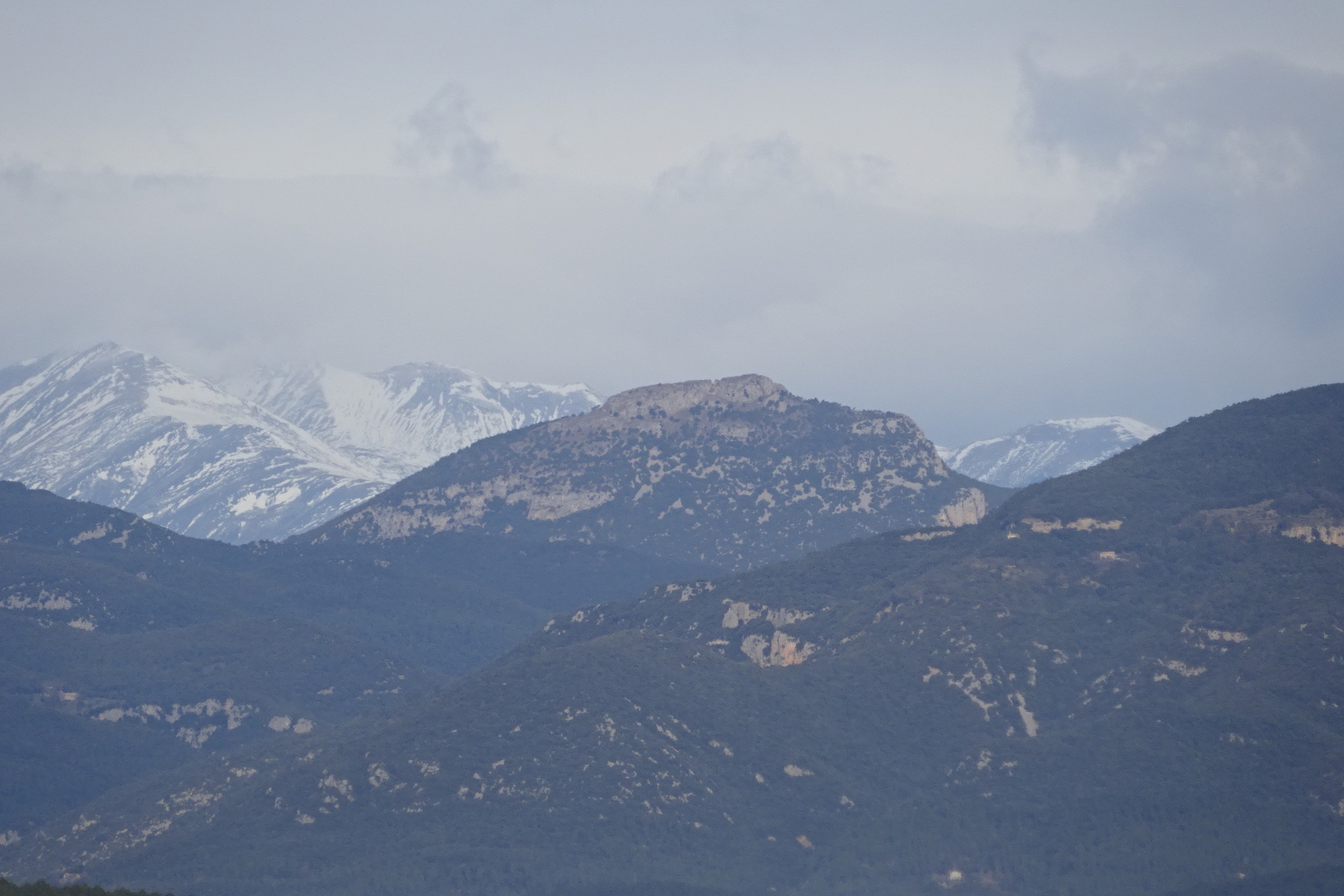 Der Blick vom Hügel Puig de Sant Martirià aus auf den See von Banyoles und die Pyrenäen.