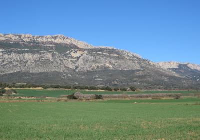 Nous commençons la vingt-quatrième étape de la traversée Transversale à (1) Àger (0 h - 600 m). Nous suivons le balisage blanc et rouge du GR 1, sur la route C-12 en direction de Balaguer, et laissons derrière nous le vieux centre d’Àger, sur notre gauche (S). Nous prenons tout de suite une piste sur la droite. Nous traversons la route qui monte vers le Centre d’Observation de l’Univers (PAM) et passons à côté du cimetière. La piste avance quelques mètres sur la route C-12. À proximité de l’ermitage de Santa Helena nous coïncidons pendant quelques mètres avec la route secondaire qui va d’Àger à Corçà. Puis nous faisons un long tronçon au milieu des champs du dénommé Pla de la Cerdanya, et débouchons dans un virage de la route d’Àger à Corçà.
