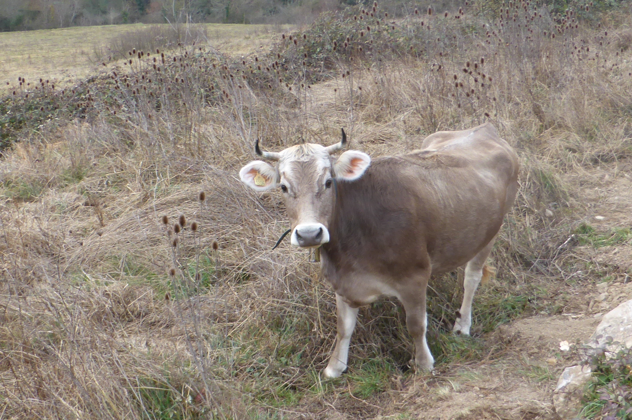 Nous commençons la sixième étape du GR 1 dans le village (1) d’Oix (0 h - 416 m), dans La Garrotxa. Nous sortons de la place Major du village en suivant le balisage blanc et rouge du GR. Nous marchons vers l’O sur une piste qui nous conduit derrière le camping La Soleia d’Oix. Nous débouchons tout de suite sur une autre piste, et passons à côté de la maison La Rodeja. Nous laissons derrière nous, sur la droite, la piste qui grimpe en direction du mas de Costejà et continuons tout droit, en claire direction de l’O, en remontant la vallée du torrent d’Oix. Nous y verrons des troupeaux de vaches pâturant dans les prés au bord du chemin, malgré l’abandon notoire des activités d’élevage et d’agriculture dans le territoire au cours du siècle passé, qui a favorisé l’expansion des forêts.