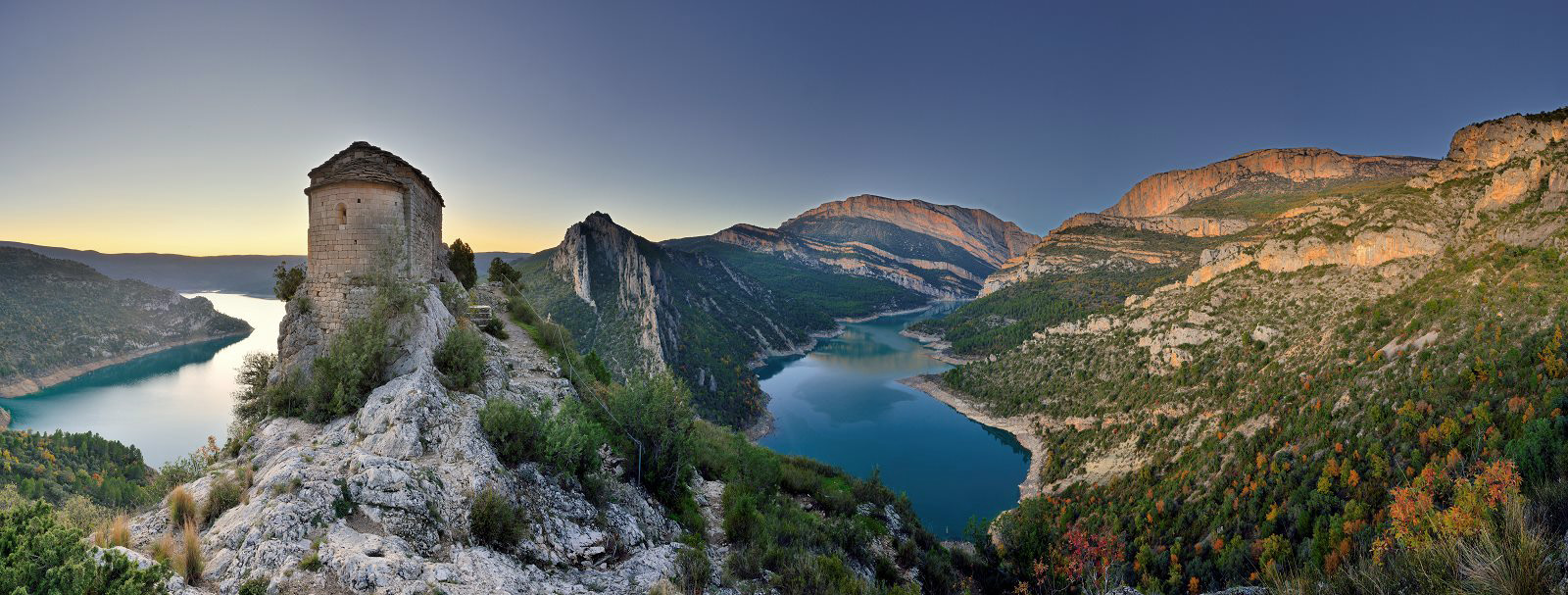 We lopen verder langs de weg tegen de afgrond en bewonderen de indrukwekkende rotswanden die gedeeltelijk meer dan 500 meter kaarsrecht omhoog lopen en die op veel plaatsen nog geen 20 meter van elkaar verwijderd zijn. Het is onmogelijk om niet even stil te staan om een foto te maken. Bijzonder bezienswaardig zijn de Colomera-grot, een uitkijkpunt over het stuwmeer van Canelles of, aan het eind van de route, de Pertusa-kapel. Dit bovenaan een ravijn, op een hoogte van 685 meter gelegen kapelletje troont al sinds acht eeuwen uit boven het landschap. Het maakt deel uit van de zogenaamde hangende kapellen van Àger, een groep van twaalf kleine kapelletjes, gelegen op onmogelijke plaatsen, wellicht om strategische redenen. Het resultaat is een indrukwekkend plaatje dat uitnodigt om even stil te blijven staan en met open ogen te dromen.