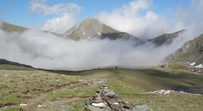 We gaan verder via hooggebergteterrein. Aan onze rechterkant ligt de rotsachtige bergkam tussen de Bastiments (2883m) en de piek van El Infern (2.869m), die de hele streek beheersen. We volgen de rivier Les Barraques stroomopwaarts en bereiken de (5) col van Tirapits (4:30u - 2.781m). We gaan verder in W. richting via de grenskam. We komen langs de bovenpiek van La Vaca (2.826m), van waaruit we kunnen genieten van prachtige uitzichten over de Estanys de Carançà ten N. We komen aan de col van Carançà en gaan verder tot aan de piek van de Fossa del Gegant (2.808m) en de (6) col van Noucreus (5:15u - 2.799m).